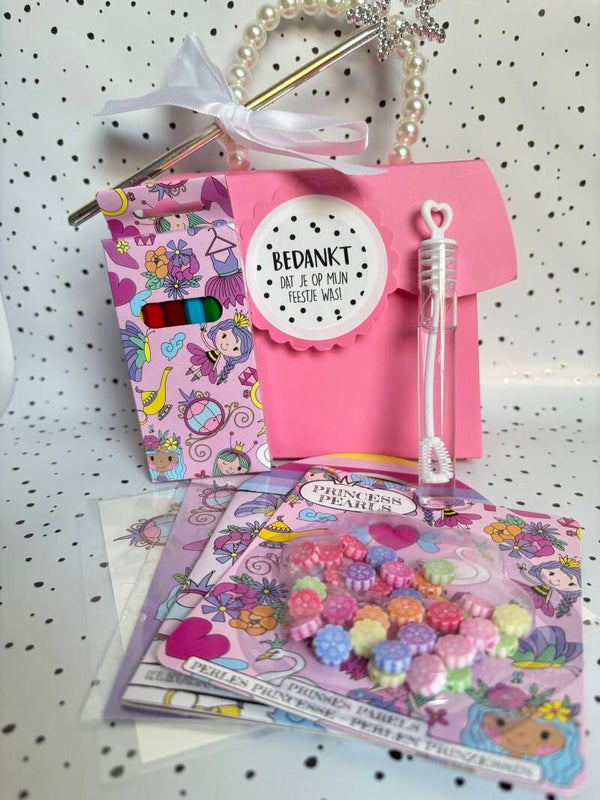 Het bevat stickers, tattoo’s, diy armband, kleurboekje, potloodjes, toverstaf en een bellenblaas. 👑